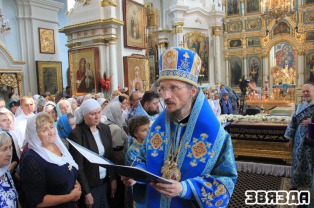 02 верасня 2019Бажэственную літургію ў храме Архістратыга Міхаіла здзейснілі архіепіскап Гродзенскі і Ваўкавыскі Арцемій і епіскап Барысаўскі і Мар'інагорскі Веніямін. Шэраг спеваў, якія праслаўляюць Царыцу Нябесную, быў выкананы на беларускай мове.