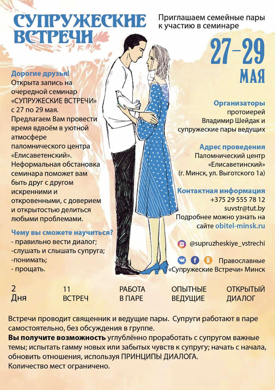 13 мая 2022Семинар «Супружеские встречи» пройдет с 27 по 29 мая в Паломническом центре «Елисаветинский» города Минска. Работа семинара предусматривает участие обоих супругов без детей. Супруги работают в паре самостоятельно, без обсуждения в группе.