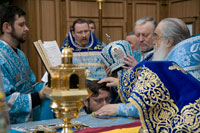 За богослужением Патриарший Экзарх рукоположил во иеромонаха иеродиакона Никодима (Генералова), кандидата богословия, преподавателя Минской духовной семинарии, выпускника Гродненского Государственного Университета (1994 г. факультет правоведения), Высшей Церковной Школы Бетель (2000 г. Билефельд, Германия), Минской Духовной Академии (2005 г.). По окончании Литургии Высокопреосвященнейший Митрополит Филарет совершил традиционное освящение свечей, после чего обратился к верующим со словом. «Пусть радость праздника вселится в наши сердца. И этой радостью поделимся со всеми нашими родными, близкими, знакомыми! Всем пожелаем в праздник ощутить эту радость, радость того, что Господь наш Иисус Христос ныне пришел к нам как Младенец, Которого на руках носила Преблагословенная Матерь и Дева и взяв Которого на руки, праведный Симеон прозрел ту милость Божию, что с Младенцем Христом новорожденным пришла в мир, мир людей. Он первый это почувствовал и сказал: «Ныне отпущаеши раба Твоего, Владыко, по глаголу Твоему с миром!» Он старец, он почувствовал завершение своего земного бытия, странствования, и был готов уже перейти в Царство Божие. Мы сегодня празднуем это событие, эту встречу праведного Симеона с Господом и Спасителем нашим Иисусом Христом. Будем молиться, чтобы Господь всех нас сподобил почувствовать эту духовную связь нас, человеков, с духовным миром, почувствовать родственную связь с ним. И каждый из нас в определенный день и час это почувствует — необходимость сказать: «Ныне отпущаеши раба Твоего, Владыко, по глаголу Твоему с миром!» Дай Бог, чтобы мы все в свое время по милости Божией ощутили эту связь и эту необходимость просить Господа отпустить нас с миром в обители Его небесные», — сказал Митрополит Филарет. Затем Его Высокопреосвященство освятил недавно установленные в алтарной части Свято-Духова кафедрального собора мозаичные изображения четырех Евангелистов.