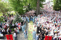 По окончании богослужения состоялся крестный ход к Явленскому монастырскому храму, где Владыка Экзарх возглавил торжественный молебен с чтением акафиста перед чудотворной Жировичской иконой Пресвятой Богородицы. По окончании молебна Высокопреосвященнейший Митрополит Филарет поздравил всех присутствующих с праздником обратившись с приветственным словом.