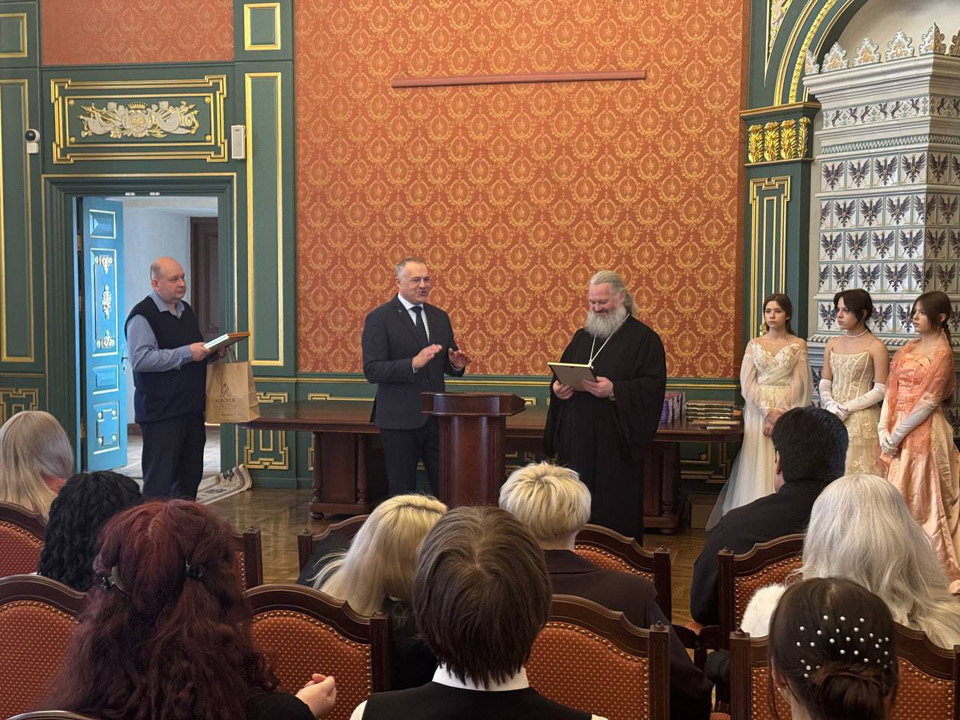 Директор Национального историко-культурного музея-заповедника «Несвиж» Дмитрий Леонидович Ященко вручил грамоты за многолетнее плодотворное сотрудничество, большой вклад в сохранение и популяризацию традиционных ценностей членам оргкомитета Митрополичьего бала молодежи протоиерею Олегу Абрамовичу, Антонию Гапановичу и Александре Мануковской.