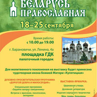 По благословению архиепископа Пинского и Лунинецкого Стефана в Барановичах с 18 по 25 сентября пройдет духовно-просветительская выставка-ярмарка «Беларусь православная». Экспозиция разместится по адресу: город Барановичи, ул. Ленина, 4а (открытая площадка у Городского Дома культуры).