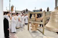 Владыка Вениамин совершил чин освящения колоколов Троицкого храма, после чего они были подняты на звонницу.
